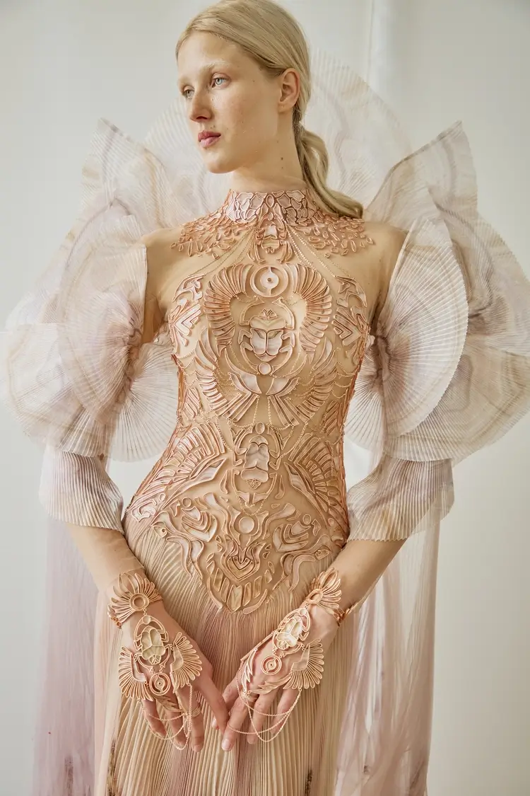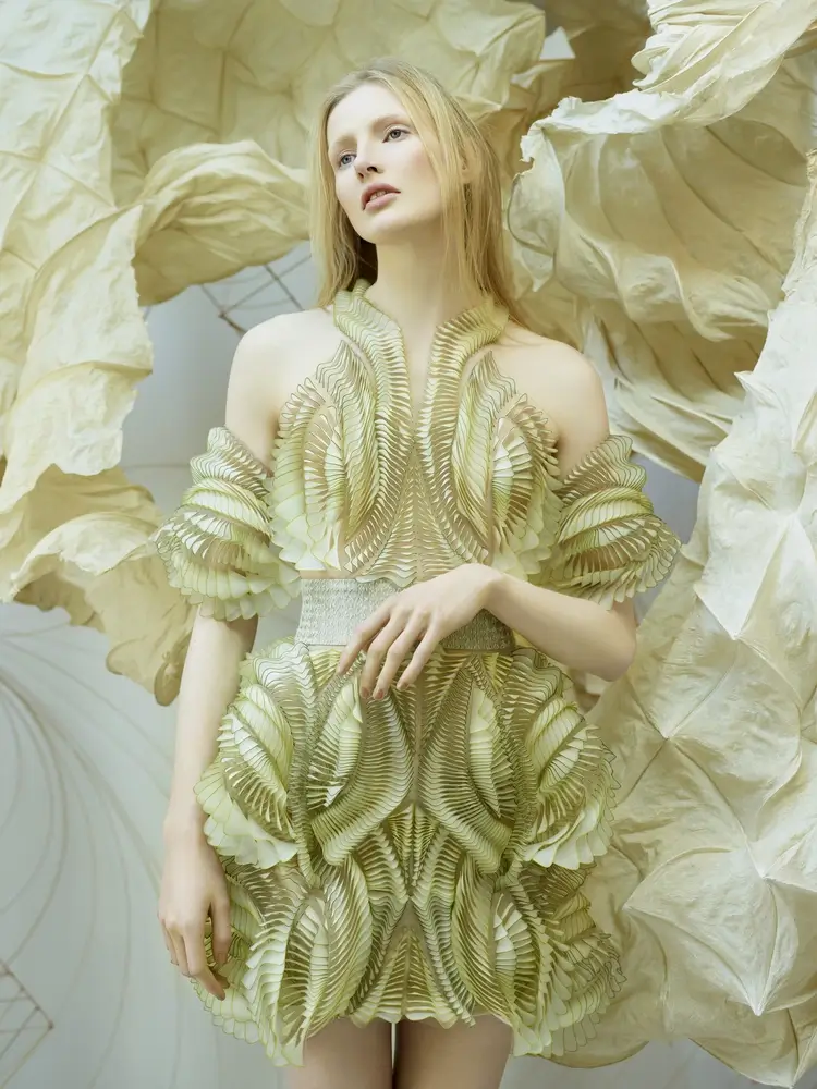 In a beautifully soft way, Van Herpen’s designs suggest an almost otherworldly nature. Her pieces, displayed in art museums and worn by the likes of Lady Gaga, Beyoncé, and Cate Blanchett, are incredibly delicate yet mesmerizingly intricate. Her silent silhouettes and subtle textures aren’t devoid of warmth, they are woven with wonder. One could say her dresses are the embodiment of life: natural, obscure, and ever-evolving. It’s this unspoken element that maintains intrigue and appeal, and it involves reading between the lines–a process that Van Herpen encourages when it comes to sharing interpretations of her breathtaking works of art.