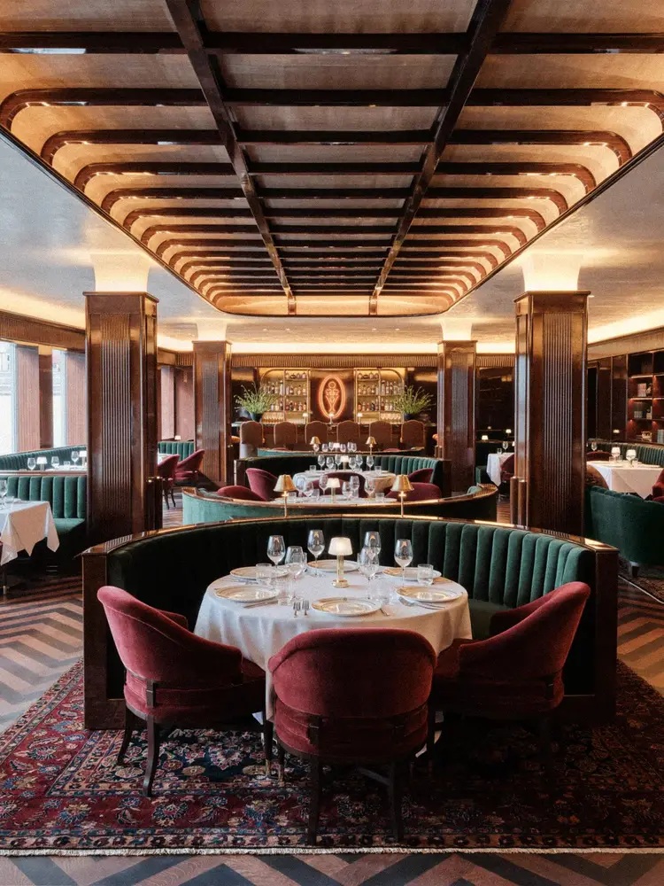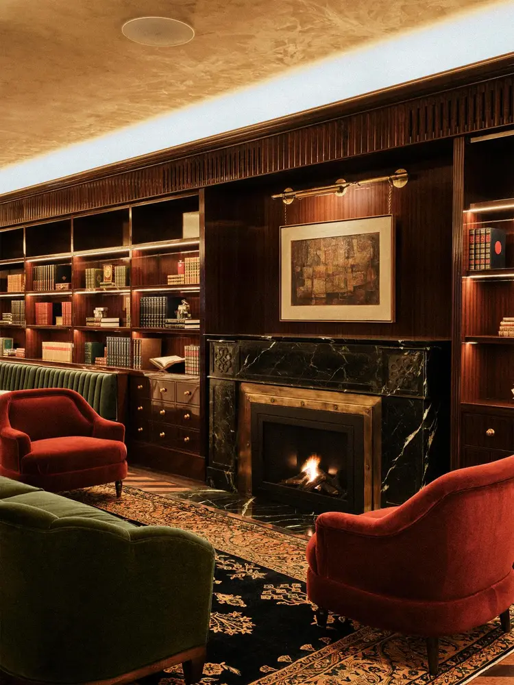 The interiors evoke the feel of a refined residence, featuring Persian rugs, rosewood details, and a central fireplace. Members have access to a pro shop, dining areas, a wellness center, a tonic bar, and rooftop padel courts.