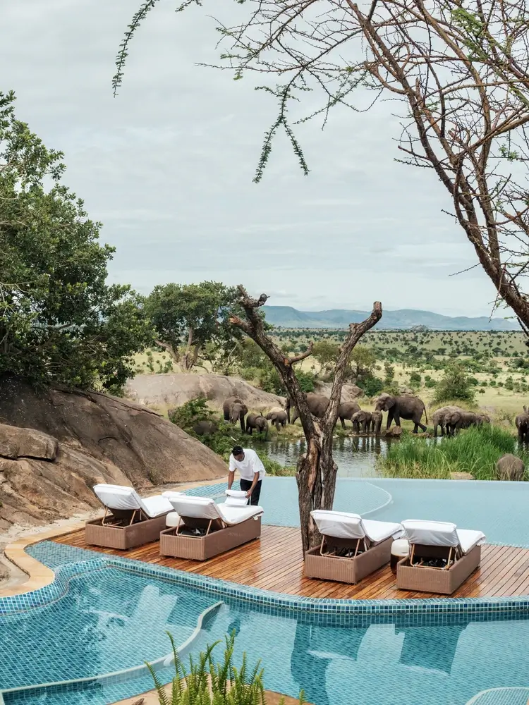 Match it with a Tanzania Safari: Watch the Great Migration pass by your balcony and elephants drink from the poolside watering hole at Four Seasons Safari Lodge Serengeti.